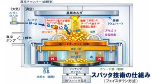 真空チャンバー内でアルゴンなどのガスを用いてプラズマを発生させ、そのイオンがターゲット(金属など)に衝突します。その衝突エネルギーで材料原子が飛び出し、ウエハー表面に付着して薄膜になります。半導体製造では