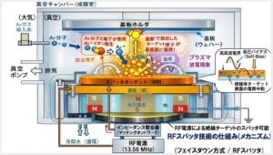 ■ 装置構成と重要ポイント:RFスパッタ装置は以下で構成されます。