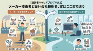【設計者キャリアブログ Vol.2】設計者としてキャリアを考えるとき、「メーカーで働くか」「設計会社で働くか」は大きな分岐点になります。弊社にはメーカー出身の技術者が多く在籍しており、両方を経験した技術者の声から、その違いをお伝えします。