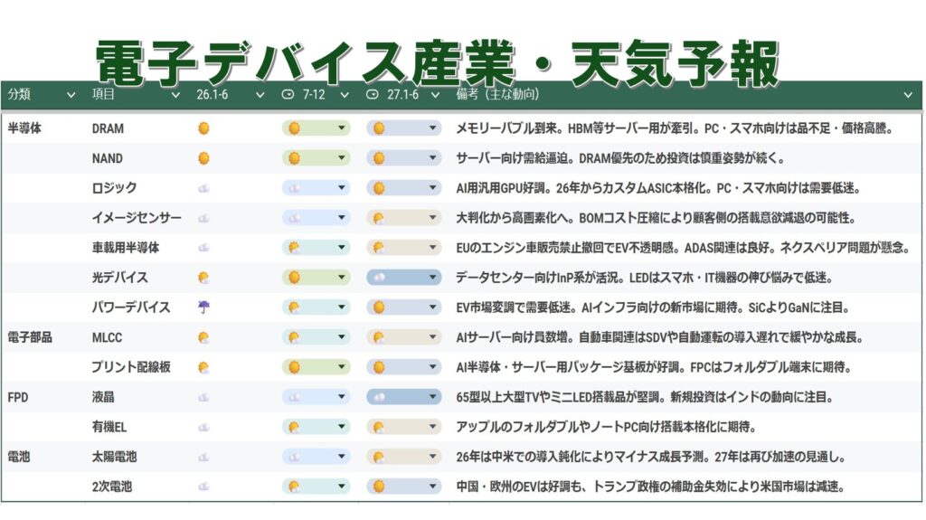 先日、電子デバイス産業新聞に掲載された「電子デバイス天気予報、空前のメモリーバブル到来」という見出しの記事が、非常に印象に残りました。2026年の半導体・エレクトロニクス市場は、ひと言で言えば「メモリーに振り回される一年」になりそうです。背... -