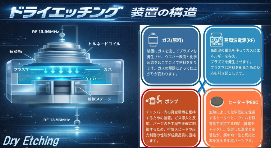 【技術コラム Vol.12】前回までのコラムでは、蒸着・CVD・ALDなど「膜を作る技術」を紹介してきました。 今回はその反対工程であるエッチング装置について解説します。 ■半導体製造は:成膜 → リソグラフィ → エッチング を繰り返しながら回路を形成してい... -