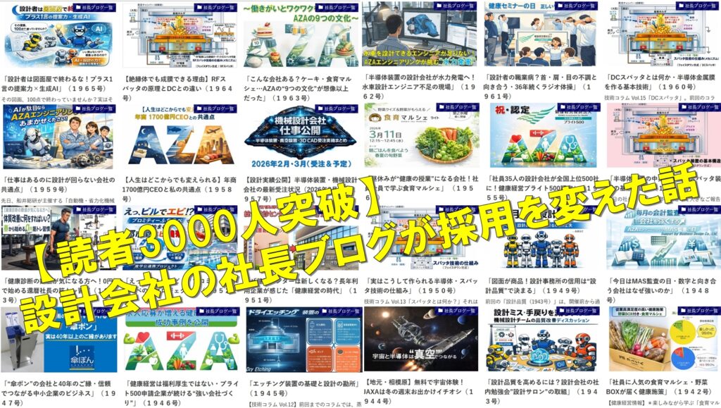 アザエンジニアリングの社長ブログは、毎日更新を続けて まもなく2000号(5月21日ごろ) を迎えます。ここまで続けてきて、改めて実感していることがあります。それは「発信は会社を変える」ということです。 この数年、社長ブログを中心に毎日発信を続... -