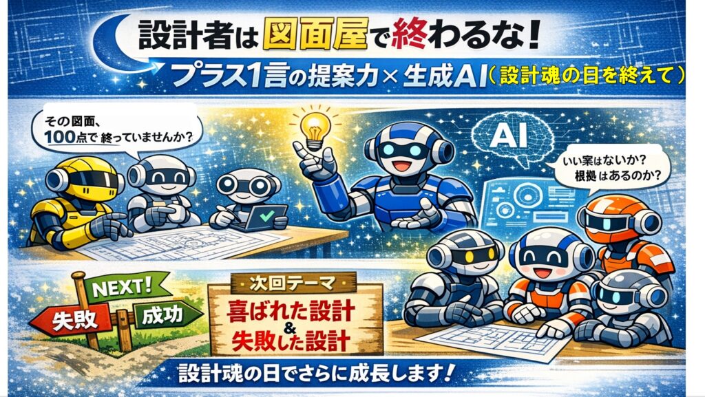 先日、第4回「設計魂の日」を開催しました。今回のテーマは「プラス1言の提案力」です。結論は非常にシンプルでした。設計者の価値は“プラス1言”で決まる。例えば 「こちらの方が組立しやすいです」 「この構造ならコストが下がります」 「メンテナンス性... -