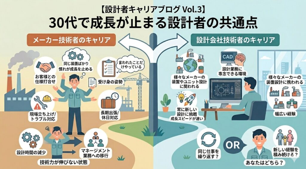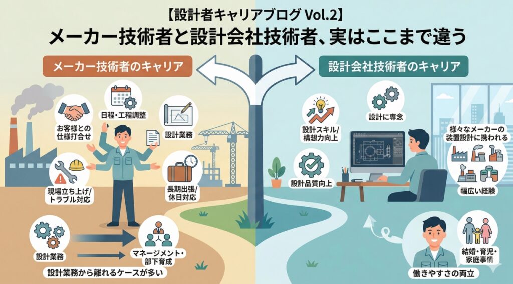 【設計者キャリアブログ Vol.2】設計者としてキャリアを考えるとき、「メーカーで働くか」「設計会社で働くか」は大きな分岐点になります。弊社にはメーカー出身の技術者が多く在籍しており、両方を経験した技術者の声から、その違いをお伝えします。 ■メ... -